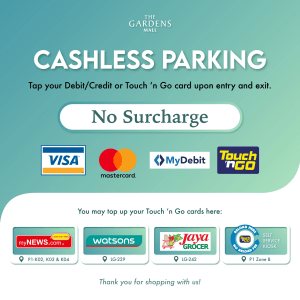 Free parking for the first 15 minutes. To enable this, please validate your Debit, Credit, or Touch ‘n Go card at any Autopay Station located at P1 before exiting.